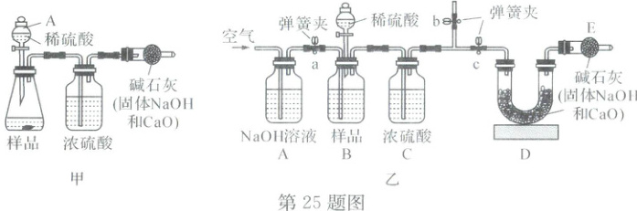 。(2)【方案改进】小明认为图甲实验方案的设计有缺陷,若按该方案进行测定会导致难以避免的误差。为减少误差,使 CO₂质量的测定更准确,该小组同学根据以上讨论,对图甲方案进行改进,设计了如图乙的实验方案(固定装置省略)。图乙 B 装置中样品在与稀硫酸反应前和停止反应后,都要通过量的空气,反应前通过量空气的目的是