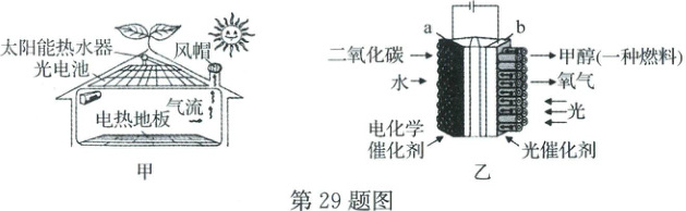 29. 图甲是一种绿色家居设计图。风帽、光电池、太阳能热水器、复合保温墙体、屋顶绿化等都是它的配置。