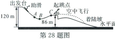 28. 跳台滑雪被称为勇敢者的运动,其基本技术动作分为 5 个部分:助滑、起跳、空中飞行、着陆、滑行至终止区。如图所示为滑雪运动员滑雪过程的示意图。
