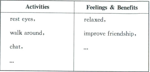 One possible version: In our school, we have a lot of activities between classes this term. For us, break time is always lively and meaningful. We rest our eyes by doing eye exercises or looking out of windows. Some students walk around the classroom, while others chat happily with friends. Many of us also do exercise in the hallway or on the playground, such as playing ball games or jumping rope to stay active and healthy. These activities help us feel relaxed and refreshed. They also improve friendship through laughter and conversations. What’s more, doing exercise during breaks keeps us energetic for the next class. It’s amazing how these activities can make such a big difference!