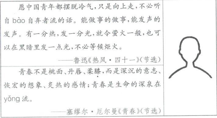 (2)涌 2.(1分)A 3.(4分)示例一:我推荐江姐。青春是青年向上、主动、热情,有社会责任感,是生命勃发的状态。江姐有信仰,有担当,有行动,她受尽折磨仍坚守信仰,展现了深沉的意志。她将个人生命融入革命洪流,在狱中领导难友抗争,以行动践行“能做事的做事”,她为了民族解放英勇牺牲,绽放青春生命。因此,选江姐作为代言人更合适。 示例二:我推荐武松。理由:武松在景阳冈赤手空拳打死老虎,展现出非凡的勇气和力量。在面对兄长被害的不公时,他毅然决然为兄报仇,手刃潘金莲,斗杀西门庆,行事果断,不向恶势力低头。他用行动诠释了青春应有的勇敢和担当,符合青春内涵,可以作为青春代言人。(评分说明:共4分,结合电子屏对青春内涵的诠释。如“向上走”“深沉的意志”等得2分;准确分析候选人在名著中的形象2分。言之有理即可。)