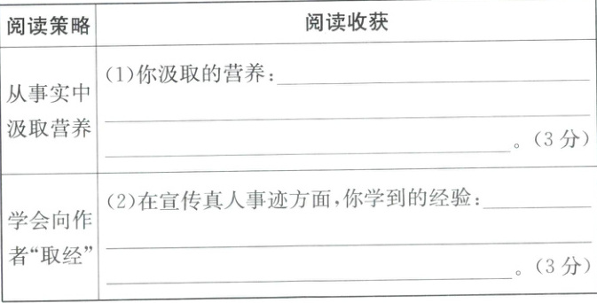 11. 阅读了《红星照耀中国》后,班级拟开展“读红色经典,获人生智慧”阅读分享交流会,请根据下面表格要求,写出你的阅读成果,准备在会上交流。(6 分)