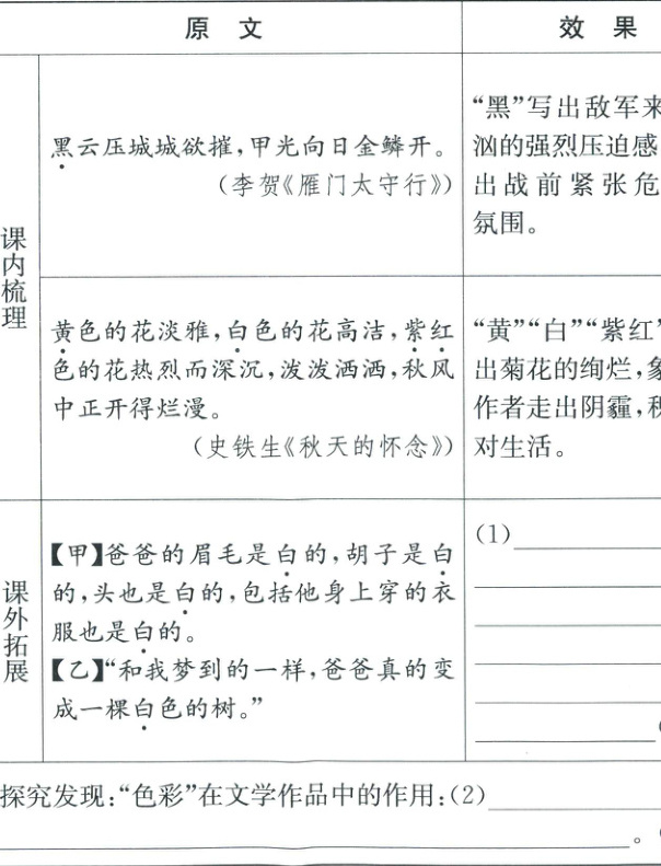 7. “白色”在本文中反复出现。结合课内梳理示例以及文中【甲】【乙】两处画线句,探究“色彩”在文学作品中的作用。(6 分)