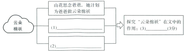 (3)“云朵棉袄”是本文的线索,山花一直想用云朵为爸爸做又轻又暖的棉袄,体现了山花对爸爸的思念和关怀;把“云朵”比作棉袄,体现出山花童真的美好的想象力,使人物形象更加饱满;“云朵”暗示了爸爸驻守高原,“棉袄”暗示了高原气候寒冷,表达了作者对驻边战士无私奉献、保家卫国的赞美,揭示主题;吸引读者阅读兴趣。[评分说明:共5分,第