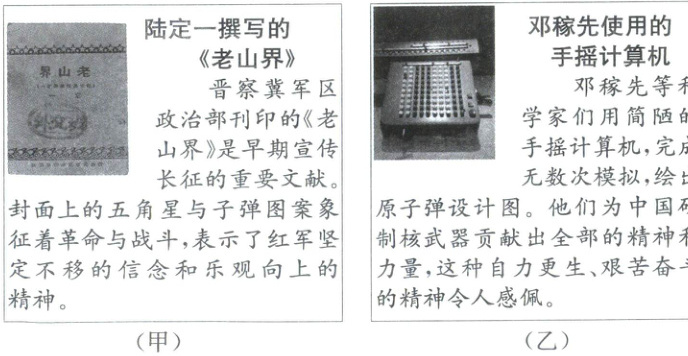 (乙)邓稼先使用的手摇计算机邓稼先等科学家们用简陋的手摇计算机,完成无数次模拟,绘出原子弹设计图。他们为中国研制核武器贡献出全部的精神和力量,这种自力更生、艰苦奋斗的精神令人感佩。