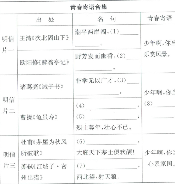 展馆需要摘录几则古诗文制作青春寄语系列明信片,请你完成相应任务。(26 分)