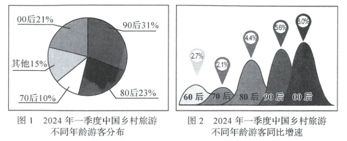 (2)80后、90后和00后是乡村旅游最重要的游客群体;其中90后是游客群体中占比最大的;00后是乡村游中同比增长最快的群体,表明这个群体对乡村旅游越来越感兴趣。[评分说明:共3分,分析图1、图2,写出三点结论,一点结论1分。]