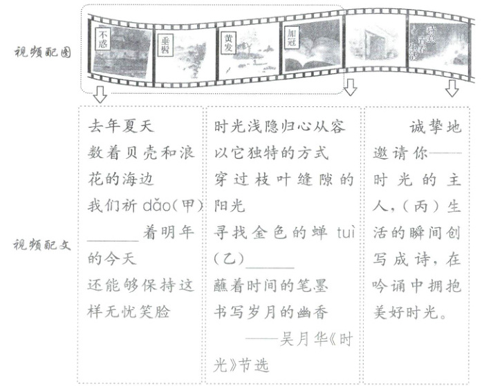 (2)①甲:祷 乙:蜕(2分) ②示例一:A.搜集。搜集的意思是搜寻事物并将其聚集在一起。生活时刻在发生,对于美好的生活瞬间,我们需要有意识地去寻找去发现,汇集记录生活之美,因此搜集更合适。 示例二:B.收集。收集的意思是使事物聚集在一起。生活的每时每刻都值得我们记录,只要有一双发现美与诗意的眼睛,我们就能将生活的瞬间汇集记录,因此收集更合适。(评分说明:共3分,词语的释义1分,根据情境写出恰当的理由2分。)