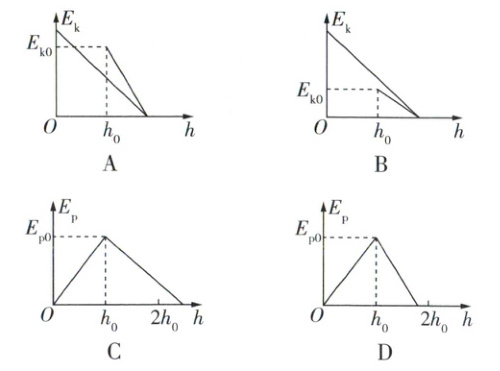 2 [2025 河北石家庄名校联合体调研]无人机下方通过细绳悬挂的重物由地面开始向上做匀加速直线运动,上升到距地面高h₀处时将细绳割断,重物在空中运动时所受空气阻力恒定,取地面重力势能为零,割断细绳后重物在空中运动过程中的重力势能Eₚ、动能Eₖ关于高度h的图像可能正确的是( )