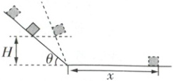 5(多选)从货车上卸载货物时,工人往往在车厢与地面间放置一倾斜的板,如图所示。板与水平地面间的夹角θ在0°~90°范围内可调,货物从距地面高H处沿板面由静止开始下滑,再沿水平地面滑动一段距离x后停下。忽略货物下滑到地面时与地面的碰撞,假设货物与板面、货物与地面间的动摩擦因数相同,货物在板上滑行的时间为t₁,在水平地面上滑行的时间为t₂。则( )