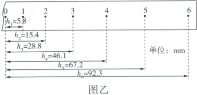 已知纸带中相邻两计数点间还有$4$个计时点未画出,计数点间的距离如图乙所示,打点计时器的打点频率$f = 50\ Hz$,重力加速度大小为$g$。
