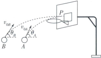 1 如图所示,小明从同一高度将相同的A、B两个篮球先后抛出,篮球恰好都能垂直打在篮板上的P点。已知篮球A、B抛出时与水平面的夹角分别为θ_A、θ_B,运动时间分别为t_A、t_B,抛出时初速度的大小分别为$v_{0A}、$$v_{0B},$不计空气阻力。则( )
