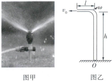 3 如图甲所示为某农场安装的一种自动浇水装置,装置可以简化为如图乙所示的模型。农田中央O点处装有高度为h的竖直细水管,其上端安装有长度为l的水平喷水嘴。水平喷水嘴可以绕轴转动,角速度为ω = √(g/(2h)),出水速度v₀可调节,其调节范围满足ωl ≤ v₀ ≤ 2ωl,重力加速度大小为g,忽略空气阻力。则下列说法正确的是( )