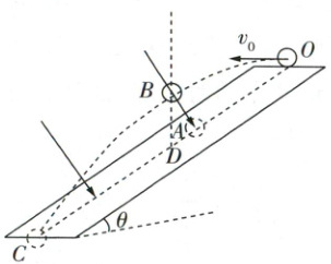 6 C 将小球的运动分解为沿斜面和垂直斜面两个分运动,可知小球沿斜面方向做初速度为$v_{0} \cos \theta$,加速度为$g \sin \theta$的匀加速直线运动,则小球在斜面上的投影做匀加速直线运动,A错误;小球垂直斜面方向做初速度为$v_{0} \sin \theta$,加速度为$g \cos \theta$的类竖直上抛运动,$B$点是运动过程中距离斜面的最远处,则此时小球垂直斜面方向的分速度刚好为$0$,根据对称性可知,$O$到$B$与$B$到$C$的时间相等,均为$t = \frac{v_{0} \sin \theta}{g \cos \theta}$,则有$L_{OA} = v_{0} \cos \theta · t + \frac{1}{2}g \sin \theta · t^{2}$,$L_{OC} = v_{0} \cos \theta · 2t + \frac{1}{2}g \sin \theta · (2t)^{2}$,可得$L_{AC} = L_{OC} - L_{OA} = v_{0} \cos \theta · t + \frac{1}{2}g \sin \theta · 3t^{2}$,则有$\frac{L_{OA}}{L_{AC}} = \frac{v_{0} \cos \theta · t + \frac{1}{2}g \sin \theta · t^{2}}{v_{0} \cos \theta · t + \frac{1}{2}g \sin \theta · 3t^{2}} > \frac{1}{3}$,故B错误;将小球的运动分解为水平方向的匀速运动和竖直方向的自由落体运动,则小球从$O$到$B$有$x_{OB水平} = v_{0}t$,小球从$O$到$C$有$x_{OC水平} = v_{0} · 2t = 2x_{OB水平}$,$D$点在$B$的正下方,则有$x_{OC水平} = 2x_{OD水平}$,可知$D$点是$OC$的中点,则$OD$与$DC$长度相等,故C正确;若小球垂直落到斜面上,则小球水平方向的分速度与斜面顶端抛出的初速度方向相反,而小球在水平方向做匀速运动,小球的水平速度方向不可能反向,则减小小球平抛的速度,小球不可能垂直落到斜面上,故D错误。