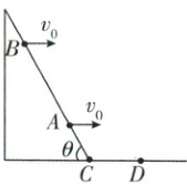 5 (多选)如图所示,有一倾角为θ的固定斜面,从斜面上的A、B两点分别以相同初速度v₀水平抛出两个小球,两个小球恰好能落到同一点D。已知C、D间距离d = 2/3m,tanθ = 3,v₀ = √5m/s,重力加速度g = 10m/s²,不计空气阻力,下列说法正确的是( )