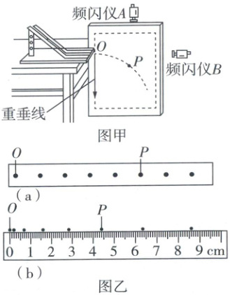 2 某小组通过频闪拍照装置探究平抛运动规律,如图甲所示,固定在硬板正上方 $ A $ 处和右侧正前方 $ B $ 处的频闪仪,每隔一定时间同时发出闪光使底片曝光,通过记录小球在闪光时刻的位置分别获得小球水平、竖直两个方向上的运动信息。从频闪照片中得到的运动信息,如图乙,$ O $ 为抛出点,$ P $ 为某时刻小球的影像,$ g $ 取 $ 9.80 \, m/s^2 $。请分析下列问题: