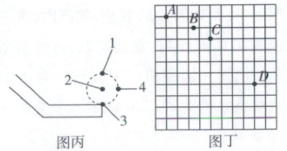 (3)用题(2)中的装置做实验,图丙所示为小球在斜槽轨道末端时的位置示意图,1、2、3、4 点分别表示小球最高点、球心、最低点、右端点在竖直板上的水平投影,小球抛出点的位置应是____(选填数字 1、2、3、4)。
