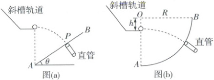 实验二:如图(b)所示,一半径为 $ R $ 的四分之一圆弧面 $ AB $,圆心为 $ O $,$ OA $ 竖直,直管保持沿圆弧面的半径方向,管口在圆弧面内,直管可以根据需要沿圆弧面移动。平抛运动实验的轨道抛出点位于 $ OA $ 线上且可以上下移动,抛出点至 $ O $ 点的距离为 $ h $。