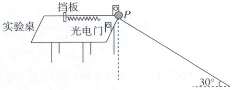 5 用如图所示的装置研究平抛运动。在水平实验桌右端固定一个光电门,桌上固定竖直挡板,水平放置的轻质弹簧一端固定在挡板上。倾斜长木板的上端 $ P $ 和桌面等高,木板紧挨着桌面且弹簧对着木板的中央,然后把木板固定,与水平面的夹角为 $ 30^{\circ} $。用小铁球压缩弹簧,然后由静止释放,小铁球离开桌面,落在斜面上,标记出落点位置 $ Q $。通过研究小球压缩弹簧的形变量不同、平抛的初速度不同、落在斜面上的位置不同,探索光电门记录的挡光时间 $ t $ 和 $ P $、$ Q $ 间距离 $ L $ 的关系,进而研究平抛运动。已知小球直径为 $ d $,重力加速度大小为 $ g $,请回答下列问题: