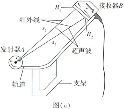 (2)$ A $ 某次发出脉冲后,$ B $ 接收到红外线脉冲的时刻为 $ t_0 $,$ B_1 $、$ B_2 $ 接收到超声波脉冲的时刻分别为 $ t_1 $、$ t_2 $,则由这三个数据可以计算出 $ A $ 在____时刻到 $ B_1 $、$ B_2 $ 的直线距离分别为 $ s_1 = $____、$ s_1 = $____(已知超声波在空气中传播的速度为 $ v $),由于 $ B_1 $、$ B_2 $ 的间距已知,由几何知识即可确定 $ A $ 在该时刻的位置;