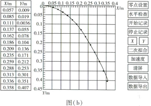 (4)如图(b)所示为某次实验得到的 $ A $ 抛出后不同时刻的水平、竖直位置坐标,点击计算机软件中的“二次拟合”按钮,绘制得到 $ A $ 做平抛运动时的 $ X - Y $ 关系图像,则____。