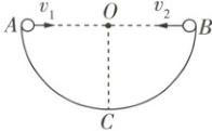 7 (多选)[2025 广东茂名期末考试]半球形碗的竖直截面图如图所示,$ O $ 为圆心,$ C $ 为半球形碗的最低点,$ AOB $ 为水平直径。两个小球甲和乙分别从 $ A $ 点、$ B $ 点同时以不同的初速度 $ v_{1} $、$ v_{2} $ 沿水平方向相向抛出,小球甲恰好落到碗上的 $ C $ 点,$ v_{2} = \dfrac{v_{1}}{2} $。两小球均可视为质点,不考虑撞到碗后的反弹情况,忽略空气阻力。下列说法正确的是 ( )