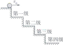1 [2025 浙江浙里联盟期中考试]如图所示,所有阶梯状台阶的高度均为 1.5 m,宽度均为 2.0 m,取 $ g = 10 \ m/s^2 $,有一小球在台阶上面平台上以初速度 $ v_0 = 5 \ m/s $ 水平飞出,小球直接落到的台阶是( )