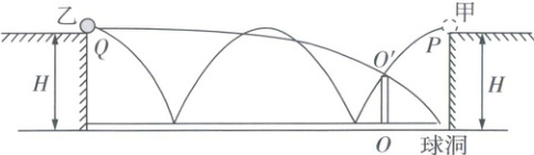 根据题意,小球从平抛到第一次落地用时为$t$,竖直方向有$H = \frac{1}{2}gt^{2}$,利用逆向思维可知,小球每次从地面反弹至最高点用时也为$t$,可知甲抛出到乙接住小球用时为$4t$,乙抛出小球后到球落入球洞用时为$t$。