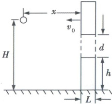 5 如图,宽为 $ L $ 的竖直障碍物上开有间距 $ d = 0.6 \ m $ 的矩形孔,其下沿离地高 $ h = 1.2 \ m $,离地高 $ H = 2 \ m $ 的质点与障碍物相距 $ x $。在障碍物以 $ v_0 = 4 \ m/s $ 匀速向左运动的同时,质点自由下落。为使质点能穿过该孔,$ L $ 的最大值为______ $ m $;若 $ L = 0.6 \ m $,$ x $ 的取值范围是______。(取 $ g = 10 \ m/s^2 $)