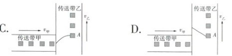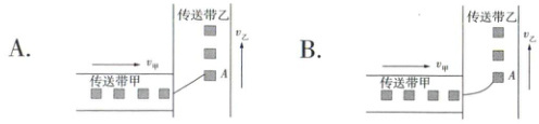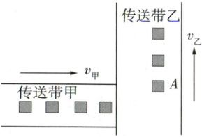 2 如图所示,生产车间有两个水平传送带甲和乙,它们相互垂直且等高,正常工作时都匀速运动,速度大小分别为v甲、v乙,将工件(视为质点)轻放到传送带甲上,工件离开传送带甲前已经与传送带甲的速度相同,并平稳地传送到传送带乙上,且不会从传送带乙的右侧掉落。两传送带正常工作时,对其中一个工件A在传送带乙上留下的痕迹,下列可能正确的是( )