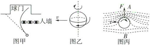 1 (多选)[2025广东模拟预测]足球比赛中,运动员发任意球时,踢出的足球有时会在行进中绕过“人墙”转弯进入球门(如图甲所示),这就是所谓的“香蕉球”。踢出“香蕉球”是因为运动员踢出球时,足球向前运动的同时还在绕轴自转(如图乙所示),自上向下观察(如图丙所示),由于足球的自转,导致足球A、B两侧的空气相对球的速度不等而产生压力差F,使得足球发生偏转。则( )
