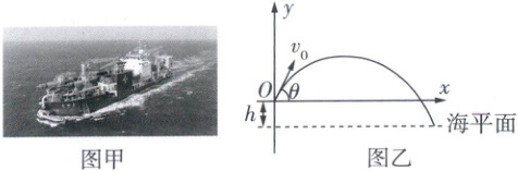 5 [新情境(多选)[2025山东德州三模]如图甲所示,“天鲲号”不仅是我国疏浚装备制造技术的巅峰之作,更是综合国力提升的重要象征。不计空气阻力,“天鲲号”在吹沙填海工程中喷出泥沙的运动可视为斜上抛运动,以排泥管口为坐标原点,建立图乙所示坐标系。排泥管口的仰角为θ,距海面的高度为h,泥沙喷出的初速度大小为v0,在排泥过程中“天鲲号”始终保持静止,重力加速度为g,下列说法正确的是( )