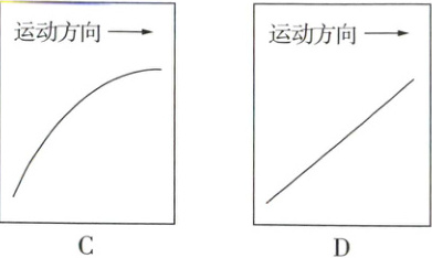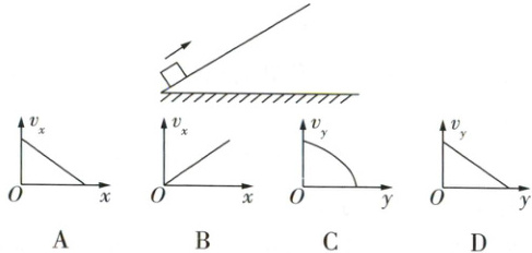 2 C 设斜面倾角为$\theta$,物块的初速度大小为$v_0$,加速度大小为$a$,则水平方向上由速度位移公式有$v_x^2 - (v_0 \cos\theta)^2 = 2(-a \cos\theta)x$,变形得$v_x = \sqrt{v_0^2 \cos^2\theta - 2a x \cos\theta}$,则$v_x - x$图像是抛物线的一部分,AB错误;同理竖直方向上有$v_y^2 - (v_0 \sin\theta)^2 = 2(-a \sin\theta)y$,变形得$v_y = \sqrt{v_0^2 \sin^2\theta - 2a y \sin\theta}$,则$v_y - y$图像是抛物线的一部分,C正确,D错误。