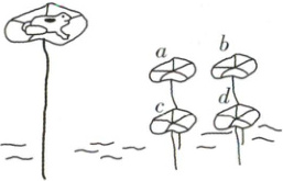 4 [2024湖北物理·3,4分]如图所示,有五片荷叶伸出荷塘水面,一只青蛙要从高处荷叶跳到低处荷叶上,设低处荷叶a、b、c、d和青蛙在同一竖直平面内,a、b高度相同,c、d高度相同,a、b分别在c、d正上方。将青蛙的跳跃视为平抛运动,若以最小的初速度完成跳跃,则它应跳到( )
