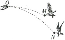 5 [2025云南物理·3,4分]如图所示,某同学将两颗鸟食从O点水平抛出,两只小鸟分别在空中的M点和N点同时接到鸟食。鸟食的运动视为平抛运动,两运动轨迹在同一竖直平面内,则( )