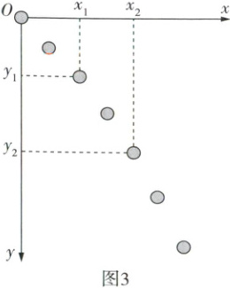 (4)某同学实验时忘了标记重垂线方向。为解决此问题,他在频闪照片中,以某位置为坐标原点,沿任意两个相互垂直的方向作为x轴和y轴正方向,建立直角坐标系xOy,并测量出另外两个位置的坐标值(x1,y1)、(x2,y2),如图3所示。根据平抛运动规律,利用运动的合成与分解的方法,可得重垂线方向与y轴间夹角的正切值为 。