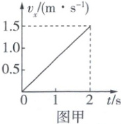 2 B 由题图甲可知,无人机水平方向的加速度大小$a=\frac{\Delta v_{x}}{\Delta t}=\frac{1.5}{2} m/s^2=0.75 m/s^2$,0~1s内无人机的水平位移为$x=\frac{1}{2}at^{2}=\frac{1}{2}×0.75×1 m=0.375 m$,0~1s内无人机的竖直位移为$y=v_{y}t_{1}=1.5×1 m=1.5 m$,0~1s内无人机的位移大小为$s=\sqrt{x^{2}+y^{2}}\approx1.55 m$,选项A错误;无人机的加速度一直不变,故1s末无人机的加速度大小为$0.75 m/s^2$,选项B正确;1s末无人机水平方向的速度大小为$v_{x}=at_{1}=0.75 m/s$,1s末无人机的速度大小为$v=\sqrt{v_{x}^{2}+v_{y}^{2}}=\frac{3\sqrt{5}}{4} m/s$,选项C错误;因无人机具有沿x轴正方向的加速度,故合力沿x轴正方向,轨迹的弯曲方向指向合力方向,无人机的运动轨迹是题图乙中的抛物线Q,选项D错误。