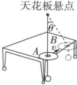 4 如图所示,一铁球用细线悬挂于天花板上,静止在桌子边缘,细线穿过一光盘的中间孔,手推光盘在桌面上平移,光盘带动细线紧贴着桌子的边缘以水平速度$v$匀速运动,当光盘由$A$位置运动到图中虚线所示的$B$位置时,细线与竖直方向的夹角为$\theta$,此时铁球( )