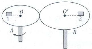 3 [2025辽宁葫芦岛联考]如图所示,水平圆盘$A$和$B$通过摩擦传动正在匀速转动,它们不发生相对滑动,固定在圆盘上的物块1和2分别相对静止在圆盘$A$和$B$上,圆盘$B$的半径是圆盘$A$的1.5倍,物块2做圆周运动半径是物块1的2倍,则物块1和物块2的向心加速度之比为( )