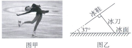 4 花样滑冰运动员在赛场上的身姿如图甲所示,假设在比赛的某段时间她单脚着地,以速度$v$做匀速圆周运动,如图乙所示,冰鞋底面与冰面间的夹角为37°,运动员的质量为$m$,重力加速度为$g$,$\sin37^{\circ}=0.6$,$\cos37^{\circ}=0.8$,冰鞋对运动员仅有垂直冰鞋底面的支持力,下列说法正确的是( )