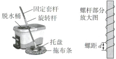 13 (多选)某班级所用的旋转脱水拖把结构如图所示,把拖把头放置于脱水桶中央,手握固定套杆向下推动,固定套杆就会给旋转杆施加驱动力,驱动旋转杆、拖把头和脱水桶一起转动,把拖把上的水甩出去。旋转杆内部有总长度为35cm的螺杆,螺杆的螺距(相邻螺纹之间的距离)为d=5cm。最下方的拖把头由金属托盘和拖布条组成,托盘半径为10cm,拖布条的长度为6cm,脱水桶的半径为12cm,某次脱水时,甲同学推动固定套杆在3s内匀速下压了35cm,乙同学在1s内匀速下压了35cm,下压过程中拖把头均可视为匀速转动,则下列说法正确的是
