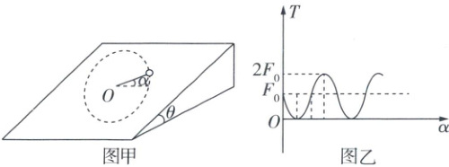 5 (多选)[2025四川遂宁模拟考试]如图甲所示,倾角为θ的光滑斜面固定在水平地面上,细线一端与可看成质点的质量为m的小球相连,另一端穿入小孔O与力传感器(位于斜面体内部)连接,传感器可实时记录细线拉力大小及扫过的角度。初始时,细线水平,小球位于小孔O的右侧,现敲击小球,使小球获得一平行于斜面向上的初速度v₀,此后传感器记录细线拉力T的大小随细线扫过角度α的变化图像如图乙所示,图中F₀已知,小球到O点距离为l,重力加速度为g,则小球( )