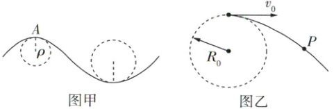 1 [2025 安徽芜湖期中考试]一般的曲线运动可以分成很多小段,每小段都可以看成圆周运动的一部分,即把整条曲线用一系列不同半径的小圆弧来代替。如图甲所示,曲线上的 $ A $ 点的曲率圆定义为:通过 $ A $ 点和曲线上紧邻 $ A $ 点两侧的两点作一圆,在极限情况下,这个圆就叫作 $ A $ 点的曲率圆,其半径 $ \rho $ 叫作 $ A $ 点的曲率半径。将圆周运动的半径换成曲率半径后,质点在曲线上某点的向心加速度可根据圆周运动的向心加速度表达式求出,向心加速度方向沿曲率圆的半径方向。如图乙所示,一个做平抛运动的物体,抛出点曲率半径为 $ R_0 $,当物体到达位置 $ P $ 时,速度方向偏转了 $ 45° $,$ P $ 点的曲率半径为 ( )