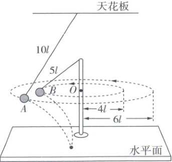 4 如图所示,小球 $ A $、$ B $ 用不同细线连接,在同一高度做匀速圆周运动,圆心均为点 $ O $。在某时刻,细线同时断裂,两球做平抛运动,同时落在水平面上的同一点。连接 $ A $、$ B $ 的细线长度分别为 $ 10l $、$ 5l $,$ A $、$ B $ 做圆周运动的半径分别为 $ 6l $、$ 4l $,则 $ O $ 点到水平面的高度为(忽略物体的大小和细线质量)( )