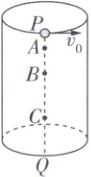 3 [2025 陕西西安模拟考试]如图所示,竖直放置的圆筒内壁光滑,圆筒半径为 $ R $,高为 $ h $。 $ P $、$ Q $ 为圆筒上、下底面圆上的两点,且 $ P $、$ Q $ 连线竖直,一可视为质点的小球由 $ P $ 点沿筒内侧与半径垂直方向水平抛出,小球质量为 $ m $,初速度大小为 $ v_{0} $。小球的运动轨迹与 $ PQ $ 的交点依次为 $ PQ $ 上的 $ A $、$ B $、$ C $ 三点,重力加速度为 $ g $,不计空气阻力,则以下说法正确的是( )