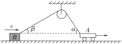 2 如图所示,水平面上汽车 $ A $,通过定滑轮用绳子拉同一水平面上的物体 $ B $,在汽车 $ A $ 的带动下,物体 $ B $ 以速度 $ v $ 向右匀速运动,物体 $ B $ 与地面的动摩擦因数为 $ 0.75 $,在图示位置时,绳子两端与水平面的夹角分别为 $ \beta = 30^{\circ} $、$ \alpha = 60^{\circ} $,则( )
