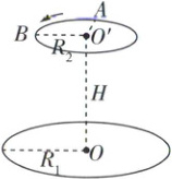 7(多选)[2025 山东物理·10,4 分]如图所示,在无人机的某次定点投放性能测试中,目标区域是水平地面上以 $ O $ 点为圆心、半径 $ R_{1} = 5\ m $ 的圆形区域,$ OO' $ 垂直地面,无人机在离地面高度 $ H = 20\ m $ 的空中绕 $ O' $ 点、平行地面做半径 $ R_{2} = 3\ m $ 的匀速圆周运动,$ A $、$ B $ 为圆周上的两点,$ \angle AO'B = 90^{\circ} $。若物品相对无人机无初速度地释放,为保证落点在目标区域内,无人机做圆周运动的最大角速度应为 $ \omega_{max} $。当无人机以 $ \omega_{max} $ 沿圆周运动经过 $ A $ 点时,相对无人机无初速度地释放物品。不计空气对物品运动的影响,物品可视为质点且落地后即静止,重力加速度大小 $ g = 10\ m/s^{2} $。下列说法正确的是( )