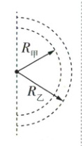 (2)如果把运动员在弯道滑行的过程看作轨迹为半圆的匀速圆周运动,如图所示,若甲、乙两名运动员同时进入弯道,滑行半径分别为 $ R_{甲} = 8\ m $、$ R_{乙} = 9\ m $,滑行速率分别为 $ v_{甲} = 10\ m/s $、$ v_{乙} = 11\ m/s $,求甲、乙过弯道时的向心加速度大小之比,并通过计算判断哪位运动员先出弯道。