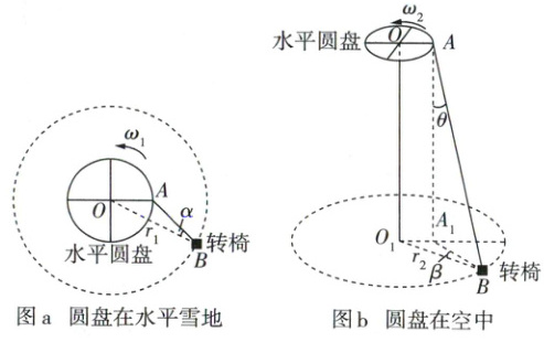 (1)在图 a 中,若圆盘在水平雪地上以角速度 $ \omega_{1} $ 匀速转动,转椅运动稳定后在水平雪地上绕 $ O $ 点做半径为 $ r_{1} $ 的匀速圆周运动。求 $ AB $ 与 $ OB $ 之间夹角 $ \alpha $ 的正切值。