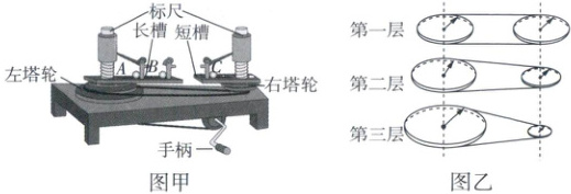 (3)若小红同学将两个质量相等的小球分别放在挡板B和C处,左、右塔轮的组合方式选择第三层,匀速摇动手柄,则左、右两标尺显示的格数之比为________。